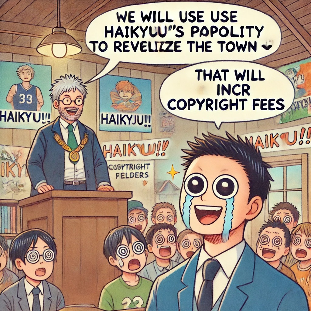町「ハイキュー!!の聖地なので町興しに利用しますw」版元「はい、著作権料が発生します」町「」